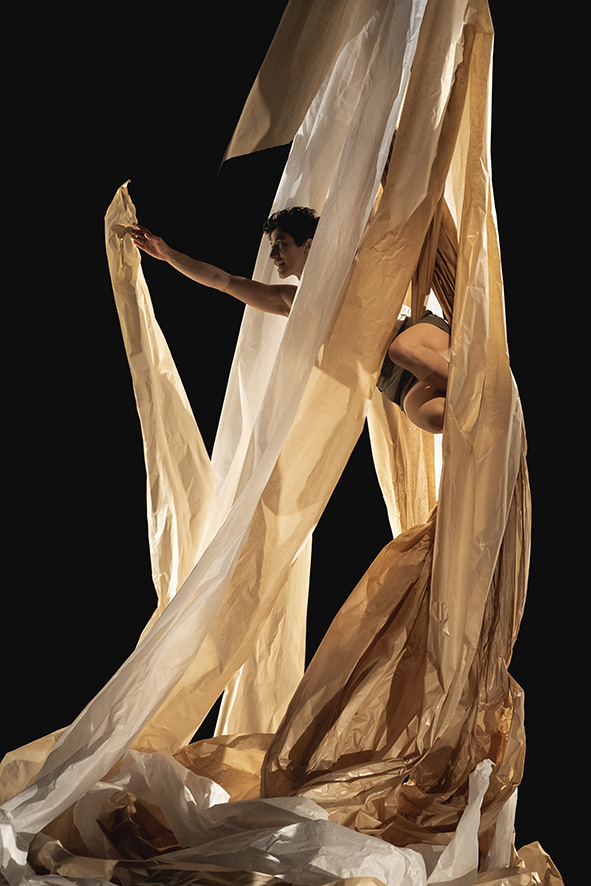 Plié, froissé, collé, tissé, glacé, découpé, mâché, déchiré, recyclé… le papier se prête à toutes les métamorphoses. Longtemps utilisé comme support d’œuvres graphiques, il s’affirme aujourd’hui comme matériau de création à part entière et c’est le cirque qui s’en empare avec Pli, la nouvelle création d’Inbal Ben Haim.