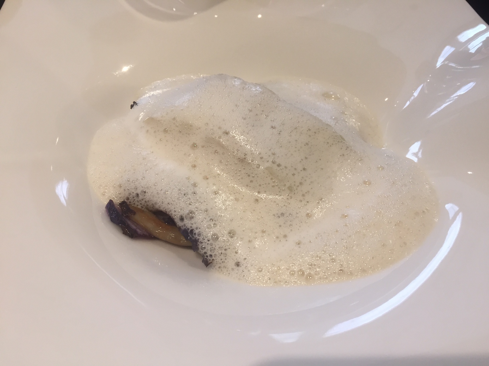 Lieu noir, émulsion de saké-kasu (lies fraîches de saké), chou chinois et champignons sautés