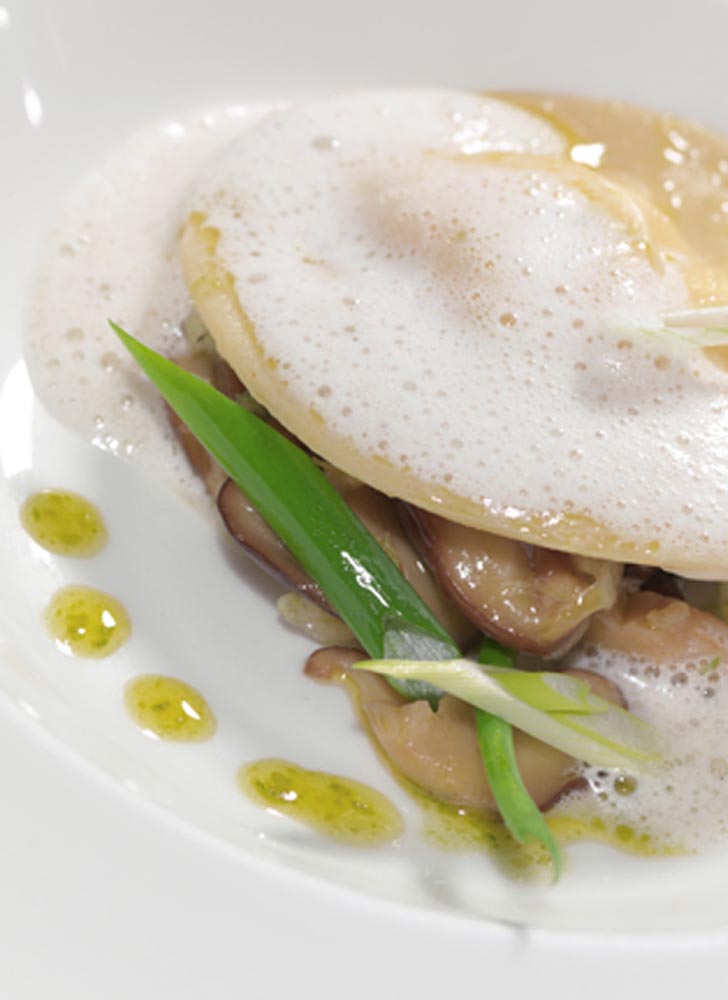 Jolie terrasse face au Grand Large avec une spécialité de ravioles de grenouilles fraîches, à la crème et aux fines herbes.