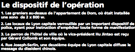 Nous avons appris par une fuite que la préfecture a prévu de diffuser de la musique chinoise, lors de l’arrivée de Hu Jintao, afin de couvrir toute prise de parole (démocrate) indésirable. En réaction, nous louons immédiatement une sono professionnelle, avec deux enceintes de 800 kW, nettement plus puissantes que celles de la police. Grillés par l’action de 1999, nos locaux ne sont plus utilisables. On installe donc ailleurs notre sono, dans un grenier du 3, place des Terreaux. Il a l’avantage d’être situé au-dessus de l’appartement de la standardiste du journal. Le matériel est lourd, il nous a fallu une quinzaine de personnes pour le monter en fin d’après-midi. Ce n’est pas très discret, mais aucun des policiers qui quadrillent la place depuis la semaine précédente ne repère notre manège.