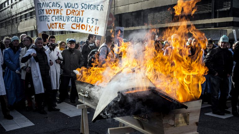 Plusieurs centaines de médecins du secteur privé ont manifesté ce lundi 5 janvier contre le projet de loi sur la santé. Devant l'agence régionale de santé à Lyon, de nombreux chirurgiens mais aussi des infirmiers ont mis le feu à un cercueil représentant la médecine libérale, en "danger de mort" selon eux.