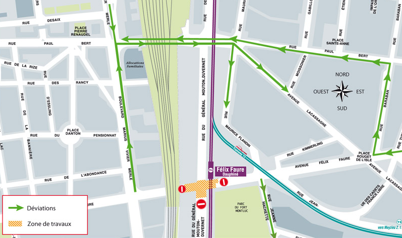 A ce niveau, la circulation de l'avenue Félix-Faure sera réduite à un sens unique, de l'est vers l'ouest. Cette modification permettra les travaux de réfection de chaussée pour le passage du tramway. Les opérations se tiendront sur le carrefour de la rue Général-Mouton-Duvernet.