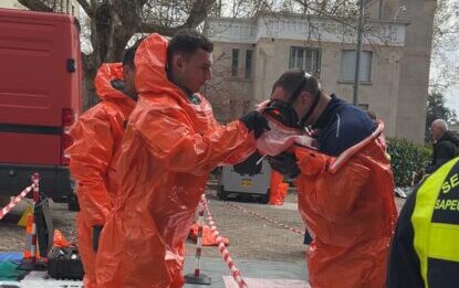 À 15 h, rendez-vous à l’extérieur du bâtiment pour une autre urgence : la décontamination de patients victimes d’une attaque NRBC (menaces nucléaire, radiologique, biologique et chimique). Les objectifs pour les étudiants : installer une chaine de décontamination et déterminer les substances incriminées à l’aide d’un spectromètre.