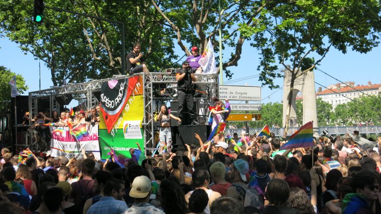 Limité à la presqu'île pour des raisons de sécurité par la préfecture, le défilé de la 22e marche des fiertés bat son plein à Lyon. Comme chaque année, plusieurs milliers de personnes dansent au rythme du son des chars, brandissant drapeaux arc-en-ciel et pancartes de revendications politiques. Marquée l'année dernière par l'attentat dans une boîte de nuit gay à Orlando aux Etats-Unis, la gaypride de Lyon a choisi cette année comme mot d'ordre : "ici ou ailleurs, nos droits ne sont pas négociables". Un des camions qui défilent est décoré d'une immense vague et porte ce message : "au cœur de la vague ou à contre-courant, ici ou en Tchétchénie, nous lutterons". Les révélations d'Amnesty International sur l'enlèvement et la torture d'homosexuels en Tchétchénie continue de "susciter un vif émoi en France et en Europe", rappelle un manifestant.