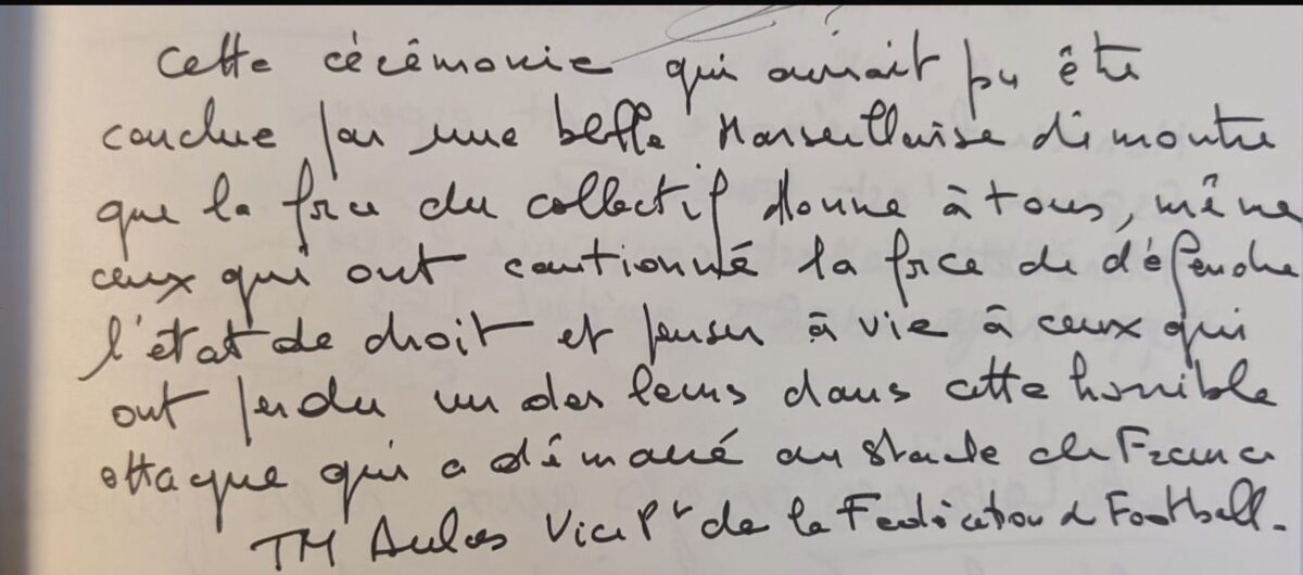 "Cette cérémonie qui aurait pu être conclue par une belle Marseillaise démontre que la force du collectif donne à tous, même ceux qui ont cautionné la force de défendre l'état de droit et penser à vie à ceux qui ont perdu un des leurs dans cette horrible attaque qui a démarré au Stade de France." Le mot est signé "JM Aulas, vice président de la Fédération de football".