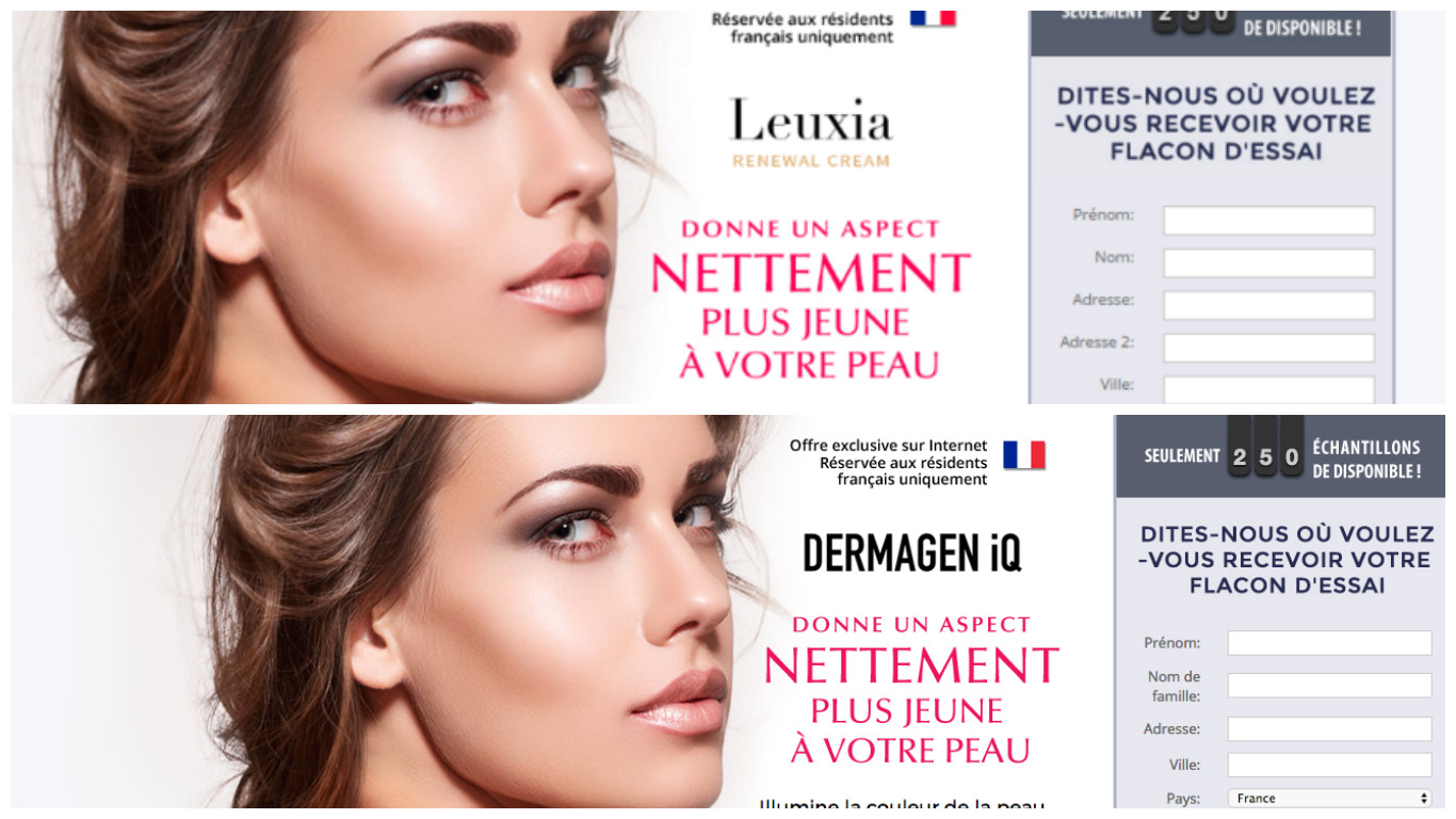 Depuis quelques jours, le site de Leuxia n’est plus disponible, mais une autre crème aux conditions d’utilisation tout aussi trompeuses a pris sa place. Dermagen iQ possède une interface similaire, ainsi que la même adresse pour les plaintes et les renvois de produits que son prédécesseur.