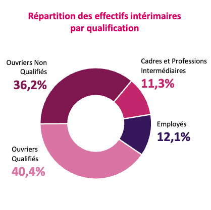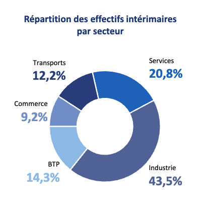 La majorité de ses effectifs sont employés dans les domaines de l'industrie (43, 5 %), du service (20, 8 %) et du BTP (14, 3 %). Le secteur du service, connaît une nette augmentation de son emploi intérimaire (+4, 1 %), au même titre que les transports (+ 3 ,8 %) et le BTP ( + 2 %). En parallèle, l'emploi intérimaire augmente chez les cadres et professions intermédiaires (+6,6 %), les ouvriers non qualifiés (+3,1 %) et les ouvriers qualifiés (+0,3 %), mais diminue chez les employés (-4,1 %)
