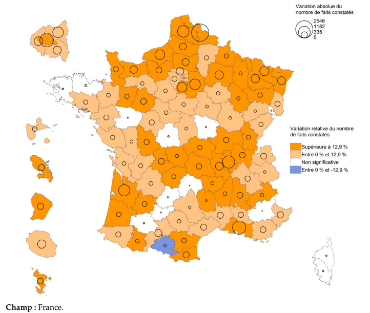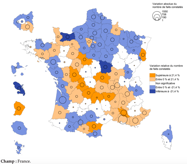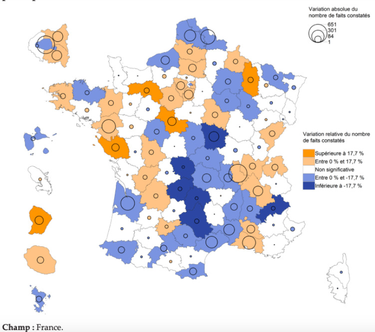 Parmi les indicateurs clés publiés par le ministère, on retrouve les faits de coups et blessures volontaires, les violences intrafamiliales, les cambriolages de logements, les vols de véhicules et les escroqueries. Ainsi, la forte augmentation de coups et blessures volontaires sur personnes de 15 ans ou plus, dans ou en dehors du cadre familial (+12 %), des violences sexuelles (+33 %) et des escroqueries (+15 %) se retrouvent dans la quasi-totalité des départements.