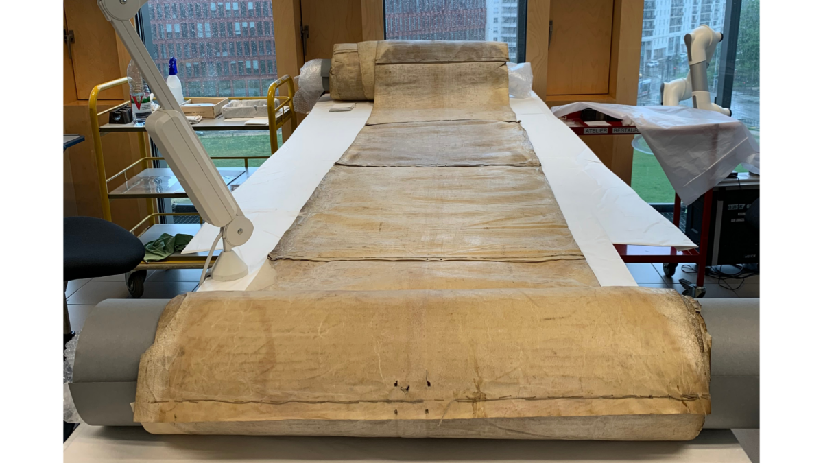 Non, ce n’est pas une question de coût. Le papier commence à se développer à partir du XIIIe siècle. Le rouleau présenté ici est exceptionnel par sa taille et son volume. Il date de 1367, à une époque où les rouleaux sont moins fréquents et où le livre tend à s’imposer. Cela pose également question : pourquoi un rouleau aussi grand et réalisé aussi tardivement ? C’est un objet qui suscite de nombreuses interrogations tout en étant très spectaculaire, ce qui explique notre volonté de le présenter au public.