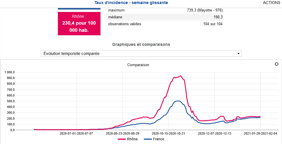 Quelques jours plus tard, même constat. Dans les chiffres, en effet, le Rhône et la région Rhône-Alpes sont sur une forme de plateau. Ca ne baisse pas vraiment, mais ça n'augmente pas non plus. Le nombre de cas reste élevé. Mais n'explose pas. La circulation du virus à un instant t sur un territoire se mesure grâce au taux d'incidence. C'est un indicateur clé. Les décideurs ont les yeux rivés dessus. Le taux d'incidence détermine le nombre de cas positifs sur les 7 derniers jours pour 100 000 habitants. Sur une semaine glissante. C'est un très bon moyen de mesuré le degré de circulation du virus à un instant t sur un territoire.