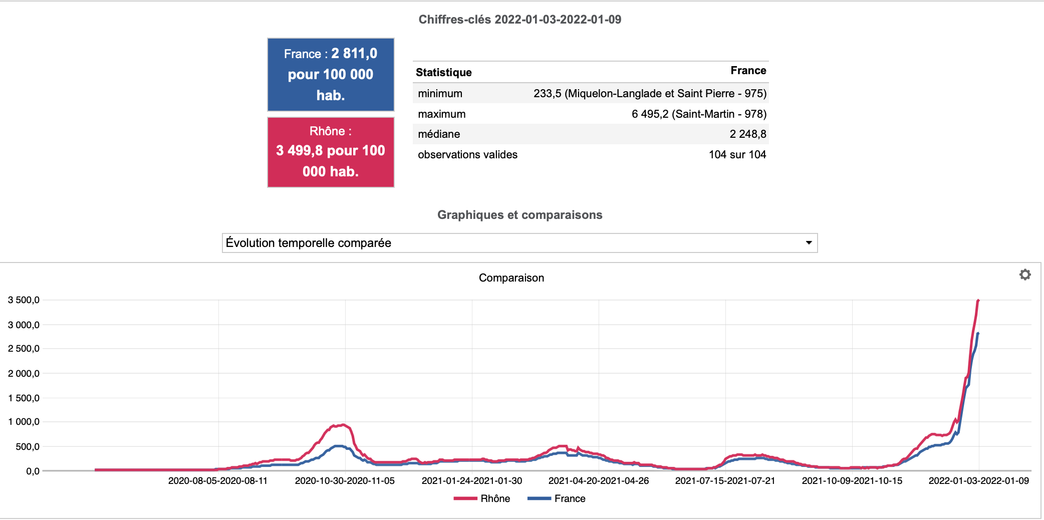 Actuellement la Haute-Savoie est le territoire de la région où le Covid-19 circule le plus activement, un taux d’incidence de 4 069 cas y étant enregistré, elle est suivie de la Savoie (4 007) et du Rhône (3 499), alors qu’en France le taux d’incidence moyen est actuellement de 2 811 cas pour 100 000 habitants.