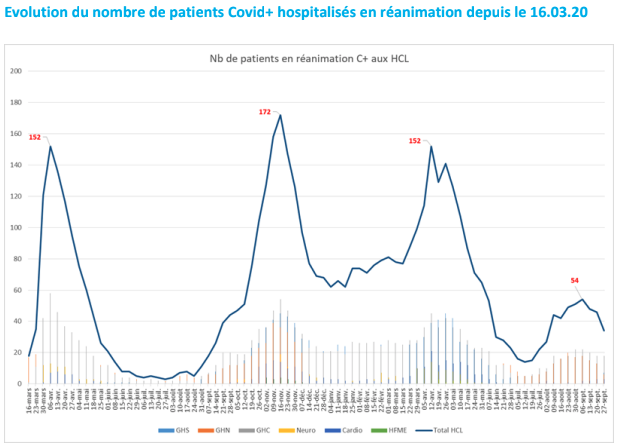 Pour mémoire, au plus fort de la 1re vague, 152 malades du Covid-19 étaient en réanimation dans les HCL, 172 au pic de la 2e vague et 152 au plus fort de la 3e.