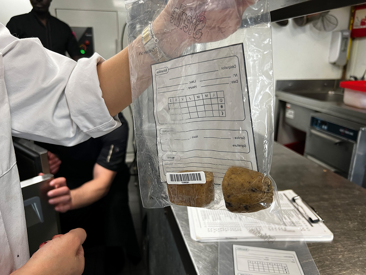 Soit 105 points de vérification, répartis en neuf catégories. Les cuisines sont passées au peigne fin pendant un peu plus d’une heure. Locaux, état des équipements, hygiène du personnel, nettoyage… tout y passe, rien n’est laissé au hasard. Ça va de l’état des plinthes, des sols et des plafonds ou des interrupteurs à la présence de lave-mains à commande non manuelle, la fermeture des poubelles, la présence d’une plonge double bac, en passant par la propreté des plans de travail et des équipements (four, piano, trancheuse, passe-plats, etc.), la traçabilité des matières premières, la séparation et la protection des denrées ou encore le contrôle des DLC et des températures. Wafa Souissi, l’auditrice conseil du laboratoire, dégaine alors un thermomètre infrarouge laser numérique. 1,1°C pour les appareils à froid, “excellente température en fin de service”. Le chef de cuisine souffle. Chaque jour, lui et son équipe relèvent les températures des matières premières et des aliments stockés qui sont consignés sur un carnet. La réglementation impose 2°C maximum pour les produits de la pêche frais et la viande hachée, 3°C pour les préparations culinaires élaborées à l’avance, 4°C pour les produits obtenus à partir de la transformation des œufs, etc. Même topo pour les produits à la livraison. “Toutes les étiquettes des matières premières doivent être conservées six mois”, explique la technicienne. Tout est en ordre. Le restaurant envisage de passer au numérique, conscient que sa collection d’étiquettes papier prend de la place. Bilan de la visite : RAS, si ce n’est un balai-brosse non accroché, une plinthe un peu sale à rénover, un joint de porte d’une cellule de refroidissement légèrement abîmé “mais qui n’a aucune influence sur la température intérieure”. Avant de partir, la technicienne du laboratoire annonce l’obligation de faire le compost alimentaire. “Comment ? On le met où ?”, demande un responsable du restaurant. “La mairie ne nous a pas donné de solution”, répond la technicienne. “Encore un truc à payer, en plus des 800 euros annuels pour les souris”, maugrée le responsable.