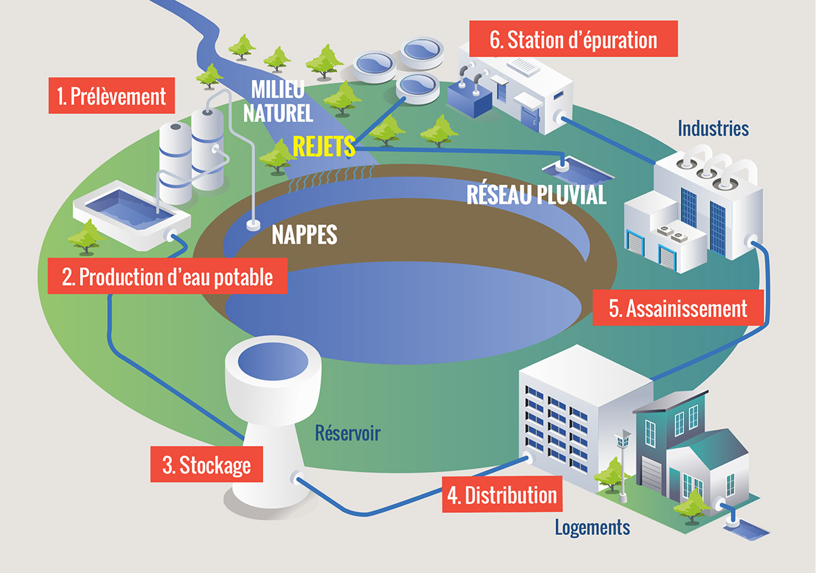 La distribution : C’est l’étape qui permet au consommateur d’accéder à l’eau potable, tant pour les particuliers que les bureaux ou l’industrie.