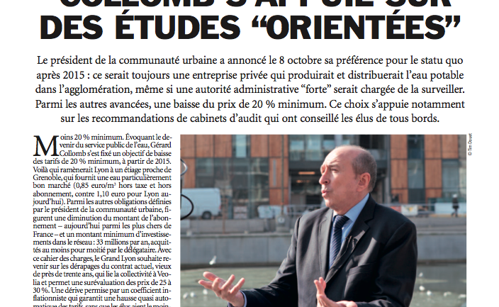 Ce lundi, aura lieu à la communauté urbaine le grand débat sur l'eau. Gérard Collomb va demander à sa majorité de valider ses intentions pour l'après 2015 : le maintien de la production et de la distribution à une entreprise privée. Il s'appuie notamment sur un rapport présenté par trois cabinets d’audit à l’objectivité relative. Extraits du dossier de Lyon Capitale-le mensuel de novembre.