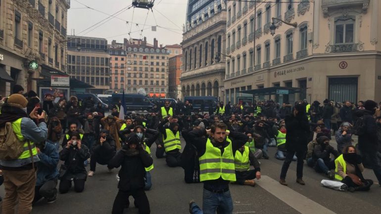 Les manifestants massés place Bellecour en début d'après-midi souhaitaient se rendre devant l'hôtel de Ville par la rue de la République. Ils en sont empêchés par les forces de l'ordre, alors que de nombreux petits groupes sont dispersés dans les rues de la Presqu'île.