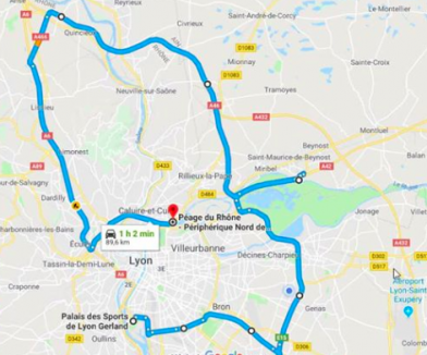 Le rendez-vous est fixé à 9h30 au Palais des sports de Gerland, pour un départ à 10h30 en direction du Groupama stadium par le périphérique et l'A46. Le cortège automobile ralliera ensuite le rond-point du Mc Donald's de Beynost, via l'A 42, où il devrait trouver des renforts. Les Gilets jaunes mettront ensuite le cap sur l'A46, en direction de Genay et du rond-point de l’Europe à côté du péage, puis sur l'A466, l'A6, en direction de la porte du Valvert. Le cortège gagnera enfin le tunnel Est-Ouest (Téo) et son péage, traditionnel point de blocage des Gilets jaunes lyonnais.