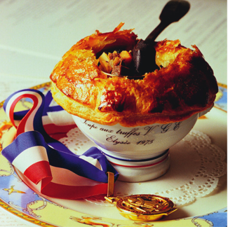 Quant à Paul Bocuse, il a mis au point, quelques semaines auparavant, une toute nouvelle recette de soupe aux truffes et dés de foie gras. "Quelques semaines avant d’être reçu à l’Élysée, je vais dîner chez mon ami Paul Haeberlin, en Alsace. Là, je déguste une truffe entière enveloppée avec des dés de foie gras dans une pâte feuilletée, le tout présenté dans une petite cocotte blanche qu’on utilise pour les soufflés. Je fais remarquer à Paul que c’est une très belle invention. “L’idée n’est pas de moi, me dit-il. Je me suis inspiré du chicken pie qu’on prépare en Angleterre.” Peu après, je suis allé rendre visite aux producteurs de truffes de Basse-Ardèche. Comme chaque année, le soir, on a été invités à manger la soupe de légumes chez les paysans. Le pépé a posé le panier de truffes au milieu de la table et a dit : “Allez, monsieur Bocuse, prenez une truffe et coupez-la en petits morceaux dans votre bol !” En rentrant à Collonges, j’ai mis au point la recette avec mon chef Roger Jaloux en utilisant une soupière à gratinée lyonnaise. Nous y avons ajouté des dés de foie gras et des blancs de volaille cuits."*