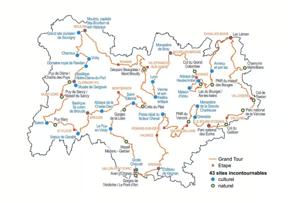 De Vichy à Vallon-pont-d'Arc, en passant par le Puy-de-Dôme et Chamonix, l'itinéraire passe par 43 sites "incontournables", dont des lieux naturels et culturels, des sites religieux, des sites patrimoniaux, mais aussi des villes et des villages : "L'idée est de mettre en avant l'ensemble des richesses de la région, que ce soit son patrimonial, naturel ou culturel", précise Delphine Chabert, responsable pôle production à la Région.