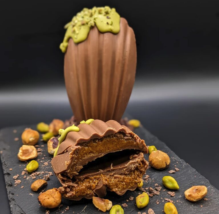 Les amateurs de madeleines vont être ravis par cette dernière proposition. Pour Pâques, la pâtisserie spécialisée Miss madeleine propose son œuf de Pâques double couche : un œuf moulé en forme de madeleine croquante au chocolat blanc, au lait ou noir. Le tout, garni de pralinés noisettes, pistaches.