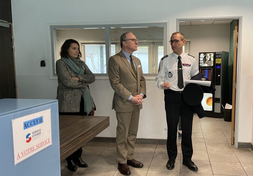 De g. à d. : Agnès Thouvenot, première adjointe à Villeurbanne, le préfet de région et du Rhône Pascal Mailhos, et Nelson Bouard, directeur départemental de la sécurité publique, en visite au commissariat de Villeurbanne pour parler de violences conjugales.