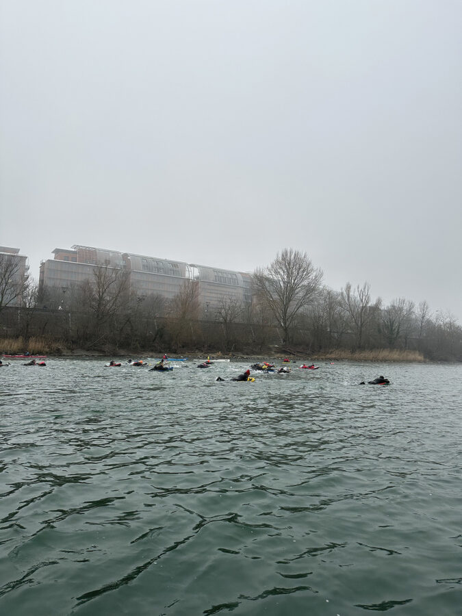 Dimanche 18 janvier, 9 h du matin. Une nuée de nageurs s’élance dans un Rhône à 9°C sous un épais brouillard. Combinaisons néoprène, palmes, dossards : la 45e Traversée du Rhône à la nage vient de commencer. Les images sont saisissantes. Des silhouettes noires qui fendent l’eau brumeuse, des kayaks du club d’Oullins qui sécurisent le parcours, cinq bateaux de sauveteurs en mer de la SNSM, des badauds médusés sur les ponts. “Qui sont ces fous ?” Ces fous, ce sont 289 nageurs – dont un Yvelinois de 65 ans venu exprès de région parisienne – qui vont parcourir 6 kilomètres de la Cité internationale jusqu’à Gerland. En moyenne, 1 heure 30 de nage, 1 heure pour les plus rapides. Avec trois catégories au départ : nage avec palmes, nage avec support flotteur et, pour la première fois, les sélections régionales de nage en eau vive. Dans les vestiaires du gymnase de la Cité scolaire de Gerland, l’excitation est palpable. Dehors, il fait 5°C. Personne ne semble s’en soucier.
