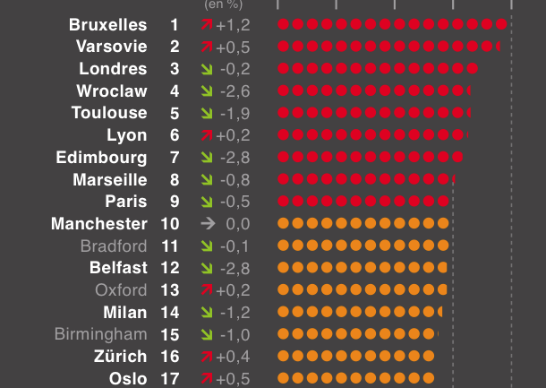 Comme en 2010, Bruxelles est la capitale européenne des villes les plus encombrées, avec 38,9%, devant Varsovie (38,1%) et Londres (34,5%). "Bruxelles subit beaucoup de travaux et les villes polonaises ont des difficultés du fait du boom de la voiture sur des réseaux qui n'étaient pas vraiment adaptés", analyse Arnaud Pézeron, directeur de la communication chez TomTom France. A l'inverse, on circule très bien à Cologne, Essen, Cambridge et Liverpool. "Plus le réseau routier est large et plus la circulation est fluide", souligne Arnaud Pézeron. Cela semble être aussi le cas à Nice et Montpellier, les villes françaises positionnées en queue de peloton.