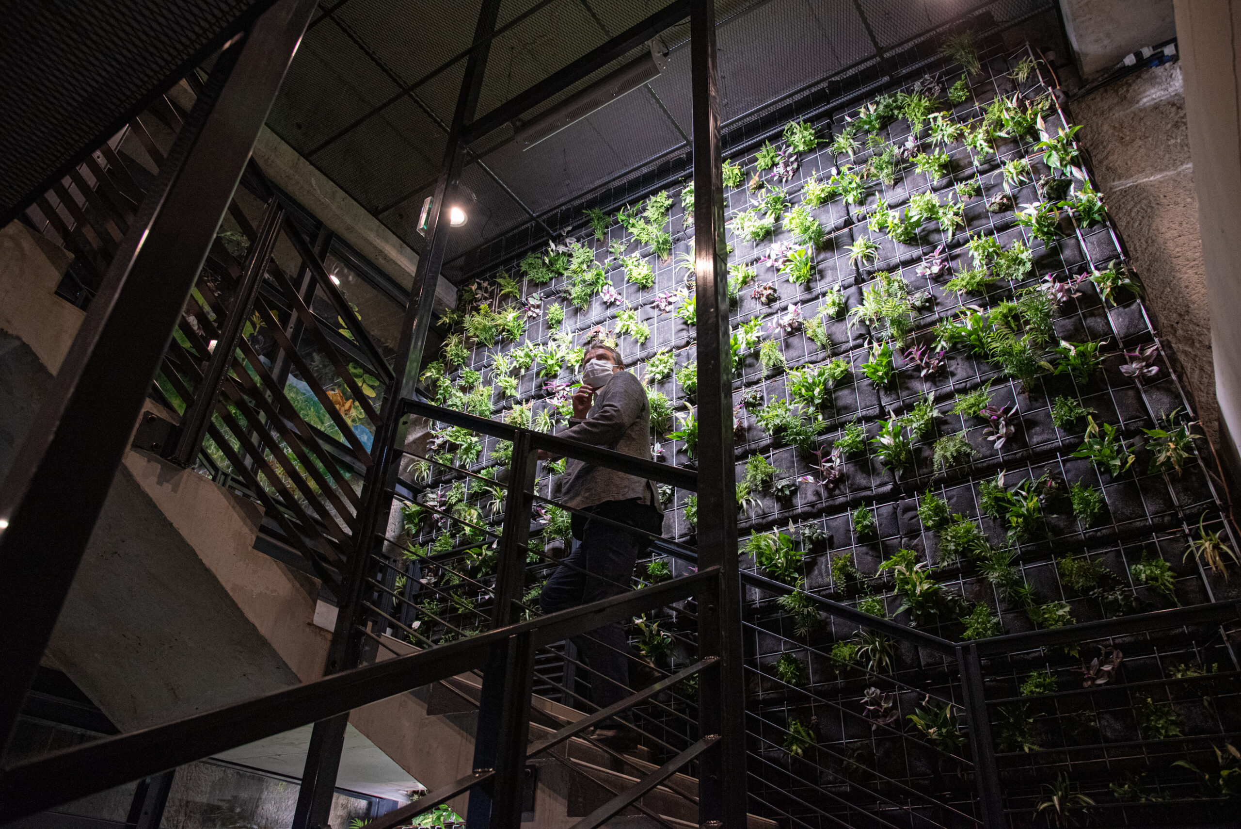 Ainsi, par exemple, un mur végétal constitué de plus de 1000 plantes (des plantes locales venant de Mornant) a été imaginé et créé. 200 places de vélos sont également disponibles, avec un atelier de réparation vélo.