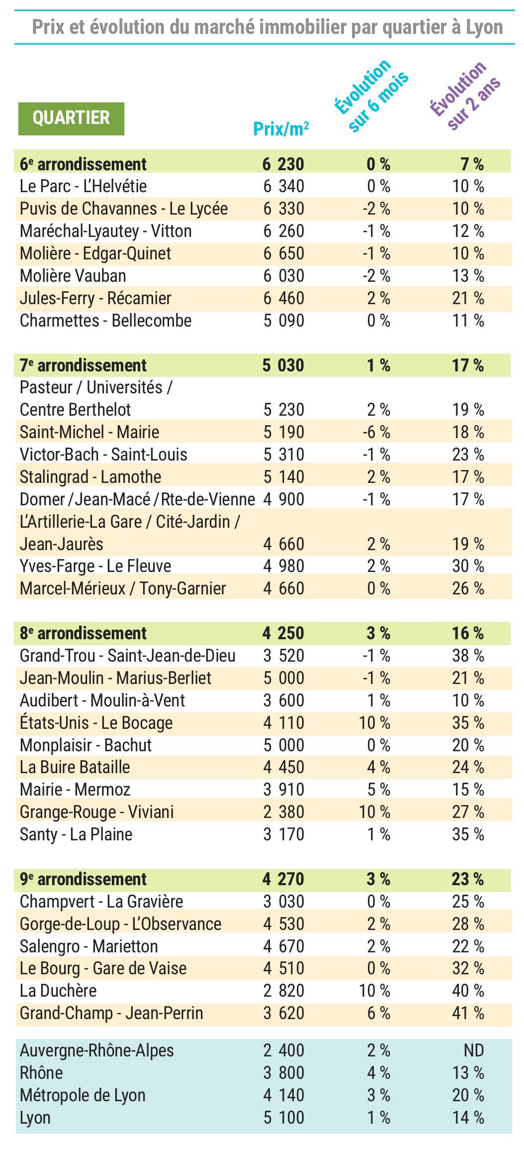 Retrouvez en micro-zoom, l'évolution des prix de l'immobilier de la ville de Lyon avec : les derniers prix (mars 2022), l'évolution sur 6 mois, sur 2 ans. Les chiffres proviennent des contrats de ventes signés par les notaires.
