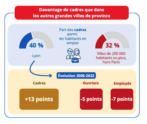 Cette montée en gamme s'explique par la tertiarisation de l'économie lyonnaise et par un effet d'attractivité sélective. Fait révélateur : 1 Lyonnais sur 2 né dans une autre région de France est cadre contre moins d'un sur trois parmi les natifs de Lyon. Les résidents originaires d'Île-de-France sont les plus qualifiés : 54 % d'entre eux sont cadres. En miroir, les ouvriers (-5 points depuis 2006) et les employés (-7 points) reculent continûment. Les ouvriers ne représentent plus que 8 % des actifs, soit deux fois moins qu'en France métropolitaine. La fracture est également très marquée selon l'origine : les Lyonnais nés à l'étranger sont beaucoup moins souvent cadres (29 %) et bien plus souvent ouvriers (19 %) ou employés (27 %).