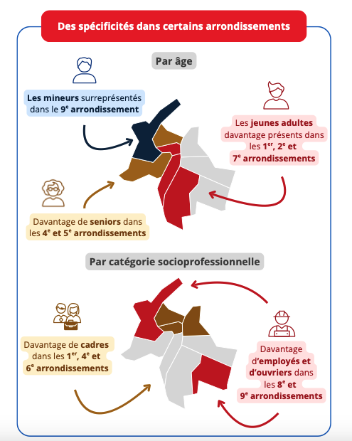 L'Insee apporte en 2026 une donnée absente des enquêtes précédentes : la carte sociale de Lyon par arrondissement qui révèle une polarisation croissante entre un centre aisé et des périphéries populaires. Le 6e arrondissement est le plus "cadre" de Lyon, avec 53 % de cadres parmi ses actifs. Plus généralement, les résidents lyonnais natifs d’Île-de-France sont en particulier très souvent cadres (54 %). Le 1er arrondissement (46 %) et le 4e arrondissement (45 %) (pentes et plateau de la Croix-Rousse) suivent de près. À l'opposé, les 8e et 9e arrondissements concentrent les plus fortes parts d'employés et d'ouvriers, dessinant des périphéries au profil socio-économique nettement plus populaire. La géographie de la jeunesse est tout aussi marquée : les 1er, 2e et 7e arrondissements concentrent les 18-29 ans étudiants et jeunes actifs. Le 9e arrondissement est, quant à lui, le plus familial de Lyon (le plus de mineurs, de couples avec enfants, de familles monoparentales). Enfin, les seniors se retrouvent davantage dans les 4e et 5e arrondissements.