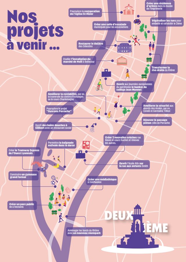 En parallèle, le candidat a réaffirmé le projet de transformer la rive droite du Rhône en un corridor de fraîcheur de 2,5 km. Il souhaite également lancer un plan "Presqu'île sportive", comprenant l'installation de nouveaux équipements sportifs sur le 2e arrondissement.