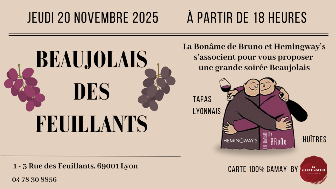 La rue des Feuillants se met aux couleurs du beaujolais nouveau ce jeudi. Rendez-vous à 18 heures dans les restaurants le Hemingway’s et la Bonâme de Bruno qui s’associent pour l’occasion. Au menu : tapas lyonnaises et huîtres autour de verres de vin. L’entrée est libre.