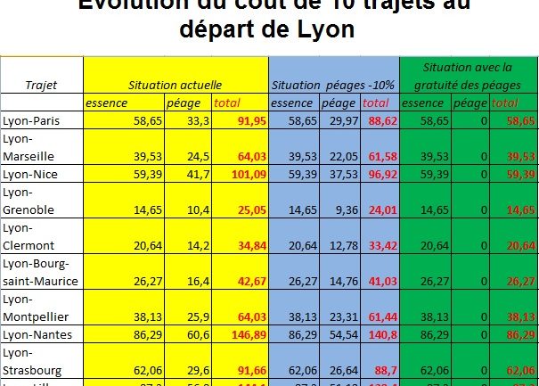 Lyon Capitale a fait le calcul sur 10 trajets autoroutiers au départ de Lyon. Pour un trajet vers la capitale, en semaine, l'économie de péage est de 3,33 euros. Avec 58,65 euros d'essence (moyenne établie à partir de différents sites de calcul d'itinéraire), cela porte le trajet Lyon-Paris à 88,62 euros au lieu de 91,95 euros.