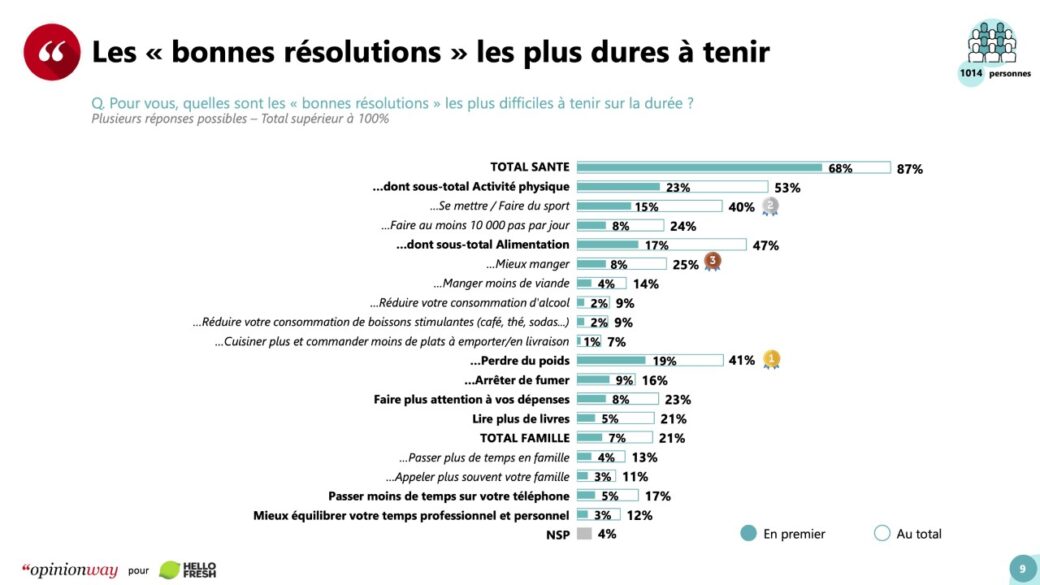 Une étude menée par OpinionWay pour HelloFresh a répertorié les résolutions que les Français pensent intenables. Elle a été réalisée du 20 au 21 décembre 2022 sur 1014 personnes représentatives de la population nationale française.