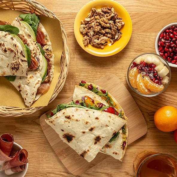Si vous voulez changer un peu des pizzas, découvrez la piadina : une galette de pain chaude dans laquelle on glisse de succulents ingrédients : fromages, charcuterie italienne…