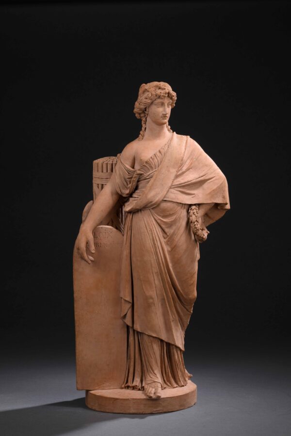 Présence d’une étiquette lacunaire à l’intérieur : 78. Statuette de ... / par Chinard. Elle représen.../ un faisceau de licteur, la main droite reposant sur les tables des lois républicaines. Terre cuite. H.47 cm/ Exposition de l’œuvre de Chinard, /aux Arts décoratifs, 1909, n°1.) Restaurations