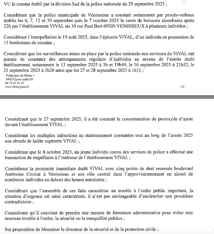 L’article relatif à la fermeture administrative du magasin Vival situé 30, rue Paul-Bert à Vénissieux expose l’établissement comme un lieu associé à des faits de trafic de stupéfiants, de consommation de protoxyde d’azote et de diverses infractions, en laissant entendre que le commerce jouerait un rôle actif dans ces comportements.