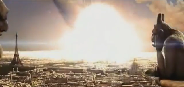 1ere séquence : le sort de Paris est réglé. Les premières images montrent une capitale carte postale (Tour Eiffel, Louvre) en couleur sépia, sur un air d'Edith Piaf. Le message est limpide : cette ville est surannée. "Bored", dit la vidéo (ennuyeux en anglais). Et comme pour bien enfoncer le clou, Paris explose, reprenant une scène du film Armageddon (1998).