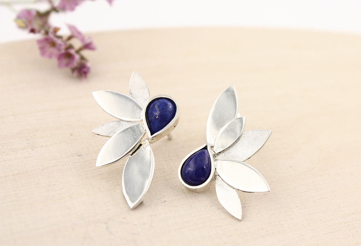 Comme chaque pièce de la collection Botanica Insolite, ces boucles d’oreilles s’inspirent des formes végétales qui peuplent la nature. Forme asymétrique, design travaillé, elles mêlent subtilement l’argent et le lapis-lazuli et s’amusent d’un jeu de contraste entre brillance et effet légèrement texturé. Chaque bijou est entièrement façonné à la main dans l’atelier de la créatrice Cécile Crepellière.