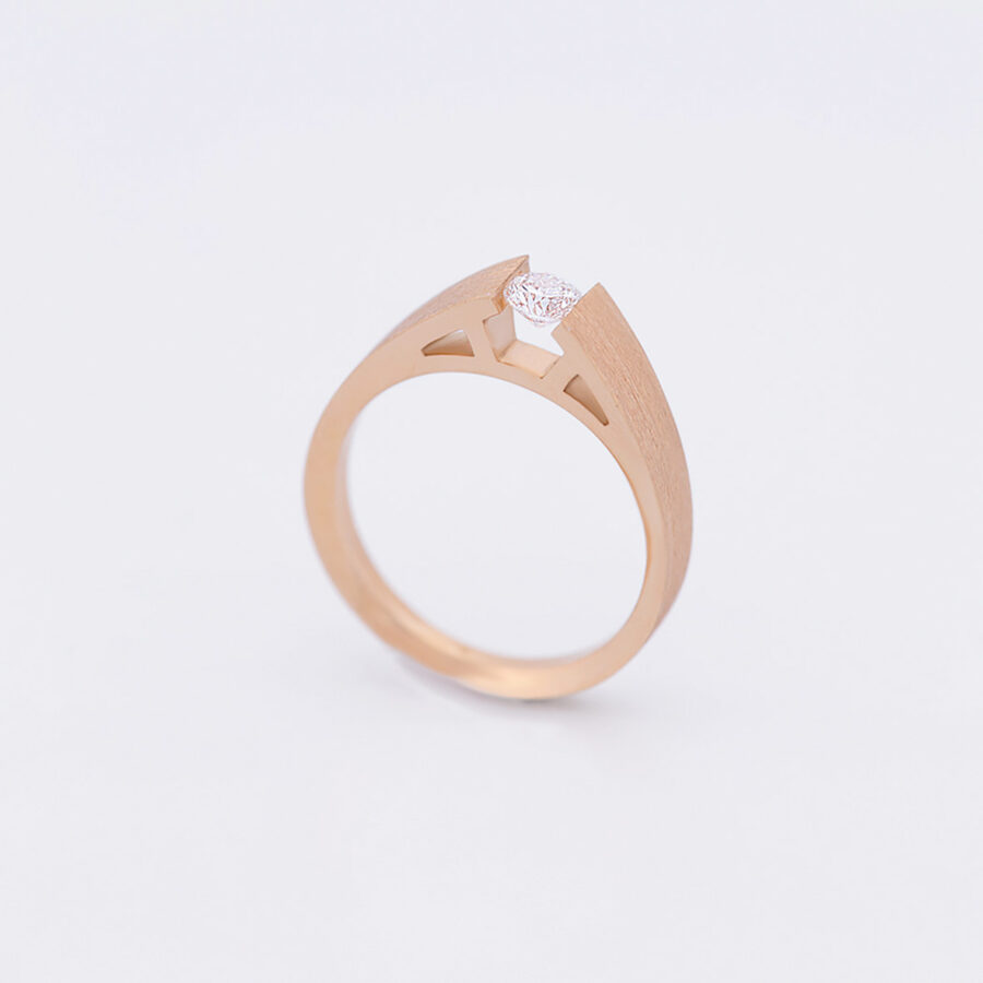 Dans son atelier lyonnais, l’artisan joaillier Rémy Challier travaille essentiellement sur mesure et façonne des bijoux à la fois intemporels et contemporains. Son credo : mettre en valeur des pierres et des perles de haute qualité par le métal. Cette bague en or jaune avec un diamant en suspension en est une belle illustration. Grâce à son serti minimaliste, le diamant est complètement exposé et dévoile généreusement toutes ses facettes.