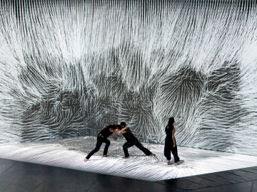 Pour cette nouvelle création, Le Mouvement de l’air, on les retrouve aux côtés de Yann Raballand, un chorégraphe plus subtil, et trois danseurs-acrobates immergés dans un espace onirique, s’élevant en l’air grâce à des dispositifs de suspension. Ils évoluent au milieu d’images générées par ordinateur en temps réel et par des capteurs posés sur scène. Les images respirent et bougent avec les danseurs pour devenir des partenaires chorégraphiques à part entière, démultipliant ainsi les explorations de la danse et des émotions visuelles.