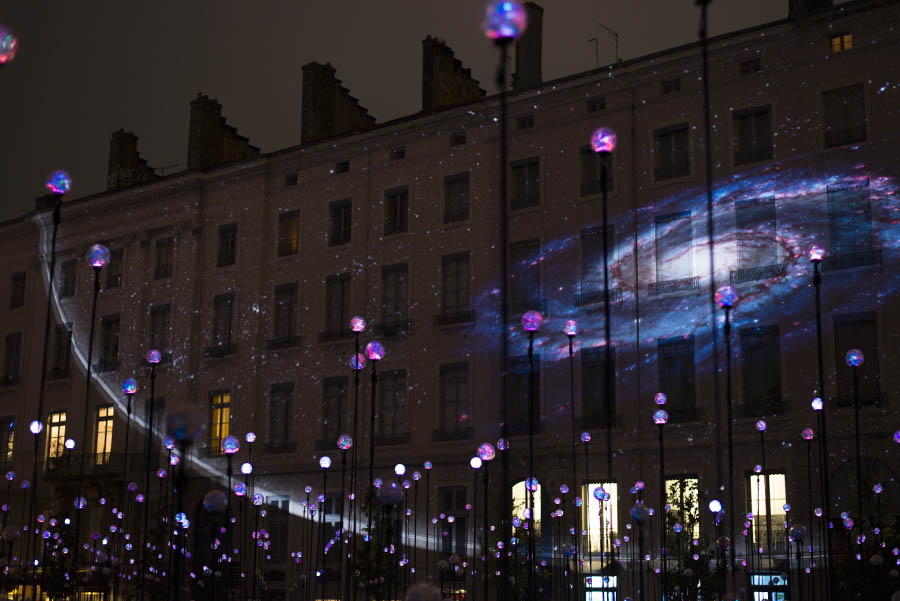 Mille étoiles sur la place Antonin-Poncet nous font voyager à travers l’univers. Renversant, Laniakea utilise aussi bien des éclairages au sol que les murs des bâtiments. Grâce à une belle mise en lumière et des images du cosmos, cette installation nous donne l’impression d’être minuscules.