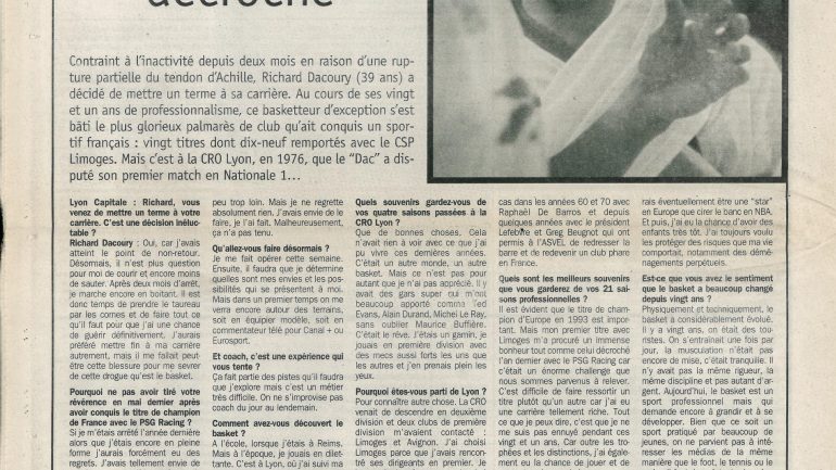 Contraint à L'inactivité depuis deux mois en raison d'une rupture partielle du tendon d'Achille, Richard Dacoury (39 ans) a décidé de mettre un terme à sa carrière. Au cours de ses vingt et un ans de professionnalisme, ce basketteur d'exception s'est bâti le plus glorieux palmarès de club qu'ait conquis un sportif français : vingt titres dont dix-neuf remportés avec le CSP Limoges. Mais c'est à la CR0 Lyon, en 1976, que le "Dac" a disputé son premier match en Nationale 1...