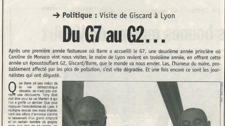 Il y a 20 ans dans Lyon Capitale - Le 20 mai 1998, lors de la venue de Valéry Giscard d'Estaing,l'ancien maire de Lyon, Raymond Barre, est au centre de l'actualité. Toutes ses tares se sont manifestées le jour de cette visite présidentielle.