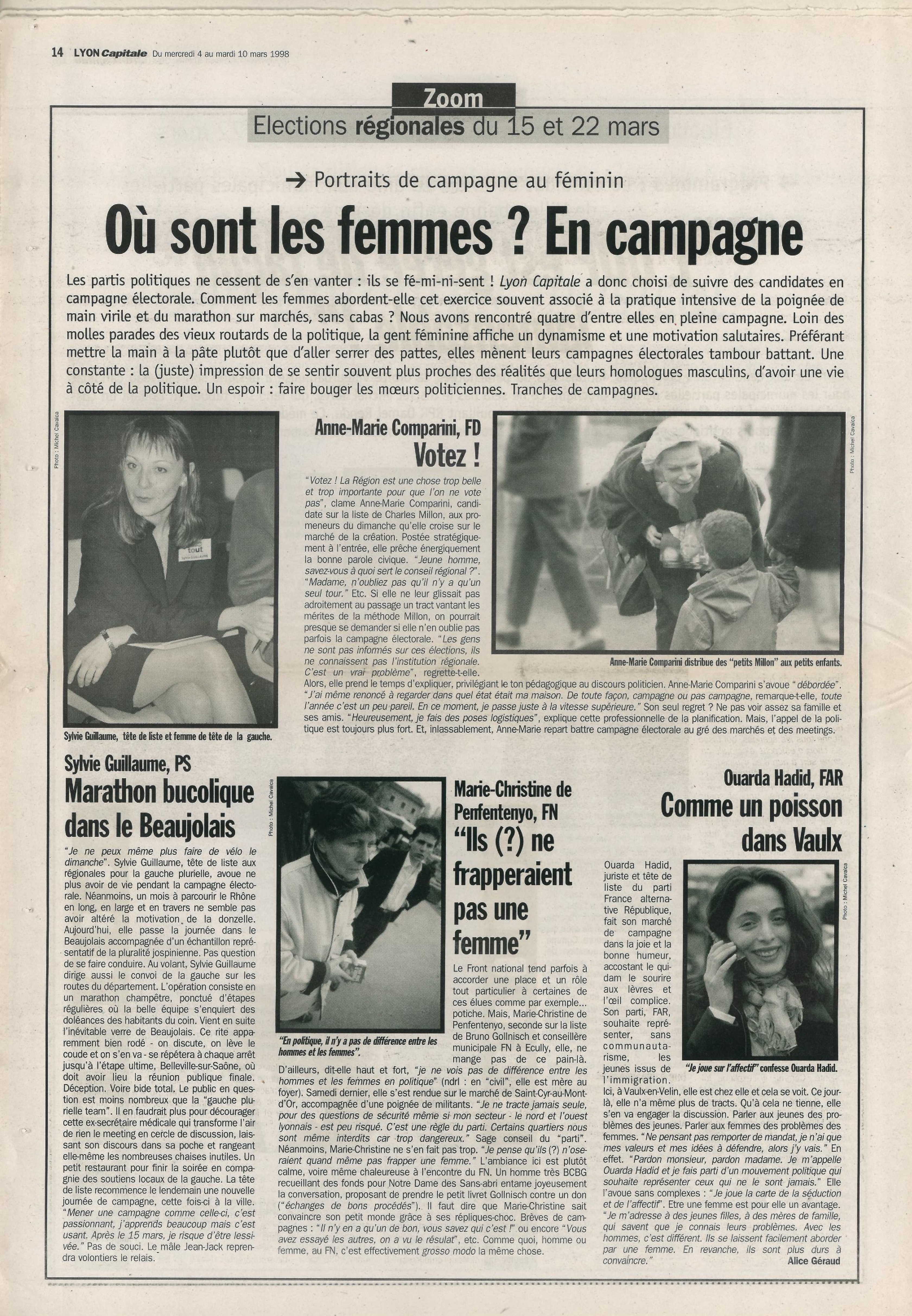 Début 1998, elles sont quatre femmes à faire bouger les lignes de la politique lyonnaise, qui n'a pas pour habitude de se féminiser. En mars de cette année, Sylvie Guillaume, Anne-Marie Comparini, Ouarda Hadid et Marie Christine de Penfentenyo se présentent aux élections régionales, et lancent tambour battant leurs campagnes respectives. Même si à l'époque, les mœurs concernant la féminisation de la classe politique commencent à évoluer, cette dernière reste essentiellement une affaire d'homme. Aujourd'hui, seule Sylvie Guillaume fait toujours de la politique en tant que députée européenne. Anne-Marie Comparini, après un séjour à la mairie de Lyon, à l'Assemblée Nationale et au conseil régional du Rhône a tout arrêté en 2007. Ouarda Hadid quant à elle, travaille à la Métropole de Lyon. Enfin, Marie-Christine de Penfentenyo a laissé de côté la politique après un poste de conseillère régionale.