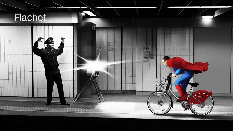On éclate de rire en voyant des supporters de l'AS Saint-Etienne dans la station Place-Guichard, en référence au nom du stade du voisin-rival stéphanois, Geoffroy-Guichard. À la station Flachet, un Superman en Vélo'v se fait flasher par un policier en tenue. À la Croix-Rousse, un belle rousse aux cheveux ondulés élève les bras en croix. Facile. Un autre cliché de la même station met plutôt en scène le métier à tisser des canuts.