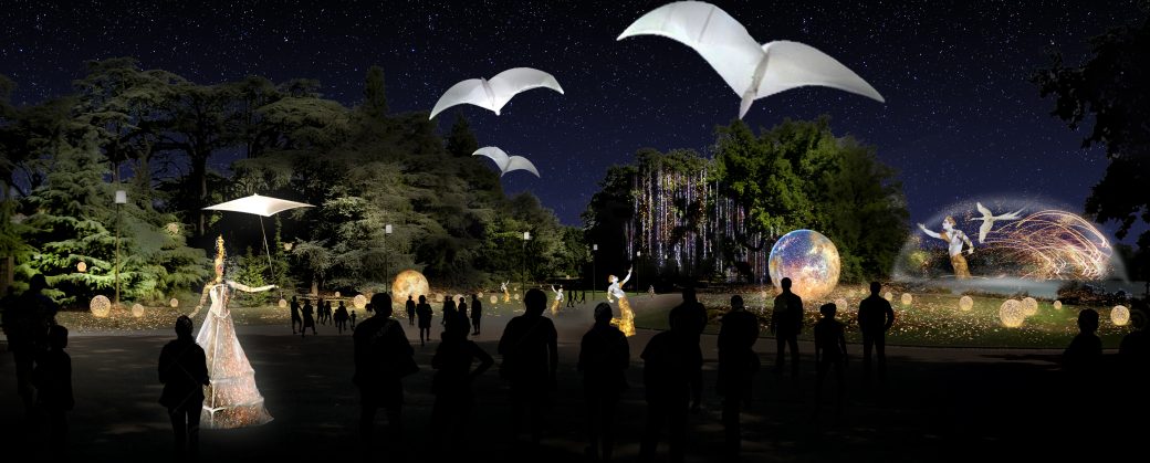 Le parc de la Tête d'or fait son grand retour avec Présages de Marie-Jeanne Gauthé et Géraud Périole. Des echassières géantes ont pris place dans le ciel, tandis qu'un magicien sort de l'eau pour animer un parc endormi.