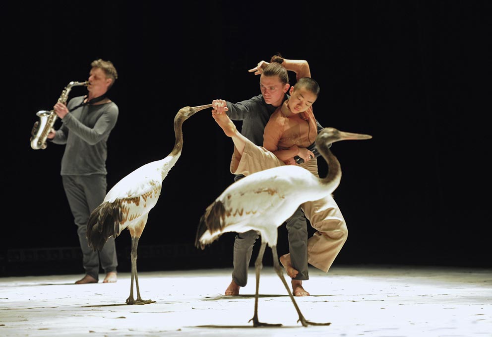 Les grues de Mandchourie sont considérées comme les oiseaux qui s’expriment le plus par la danse. Elles atteignent une taille humaine (1,60 m) quand elles se dressent le bec en l’air et vivent jusqu’à 60 ans. Le challenge pour Luc Petton était d’imaginer un spectacle avec des oiseaux danseurs, proches et en même temps loin de l’être humain.