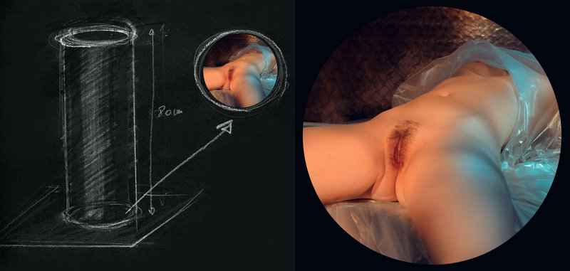 Et puis, il y a ce travail autour de L’Origine du monde, tableau peint par Gustave Courbet en 1866. Cachée par Lacan, censurée par Internet en 2011 sur le site du Danois Frode Steinicke, parodiée au masculin en réponse par Kader Attia, cette œuvre a toujours dérangé. Ici, elle est magistralement reprise, version photographique, par DM (un homme, donc)-KF (une femme). La pose est rigoureusement la même. Mais le gros plan du sexe féminin est accentué par un focus façon lorgnette, celle-ci étant dessinée scientifiquement pour révéler davantage encore notre voyeurisme dans une ambiance de bordel ou de cabinet de curiosité. Une installation mobile reprend cette forme circulaire pour mieux nous faire tourner la tête. Ne devraient se sentir provoqués que quelques patients des descendants de Lacan…